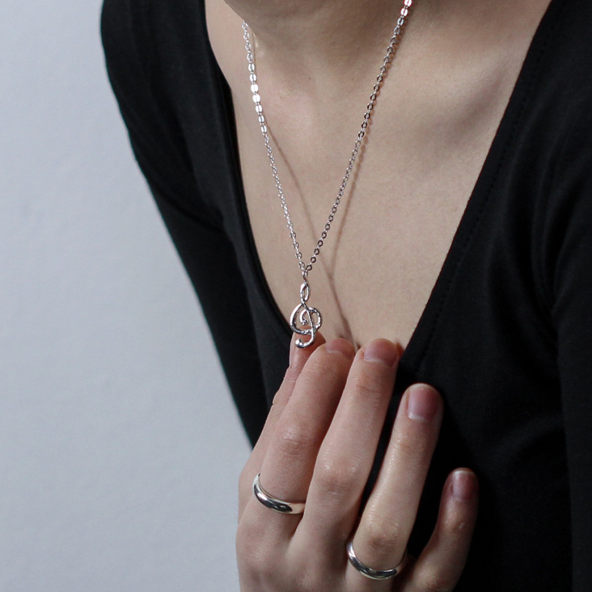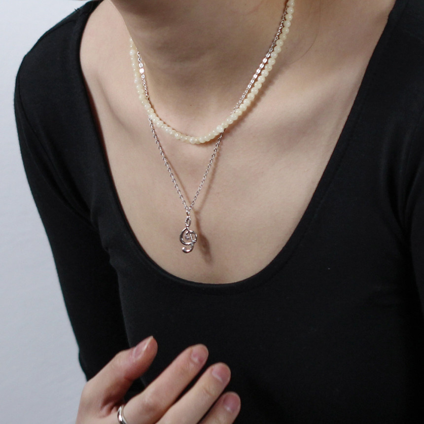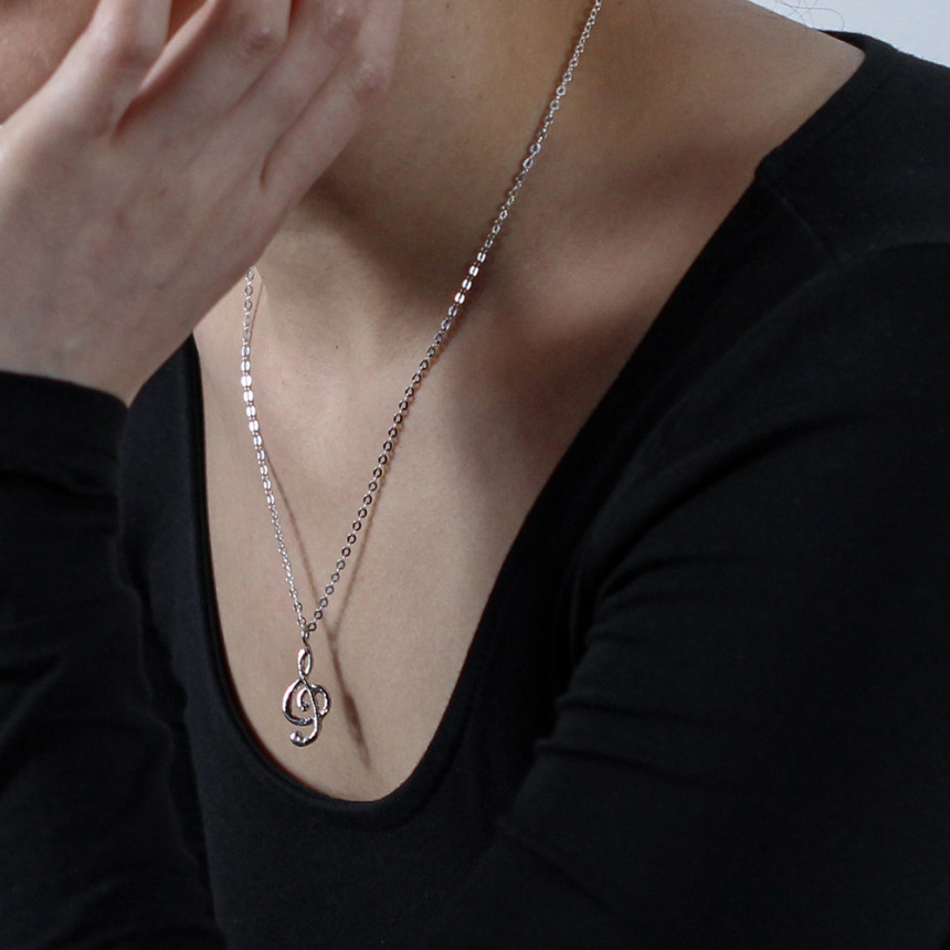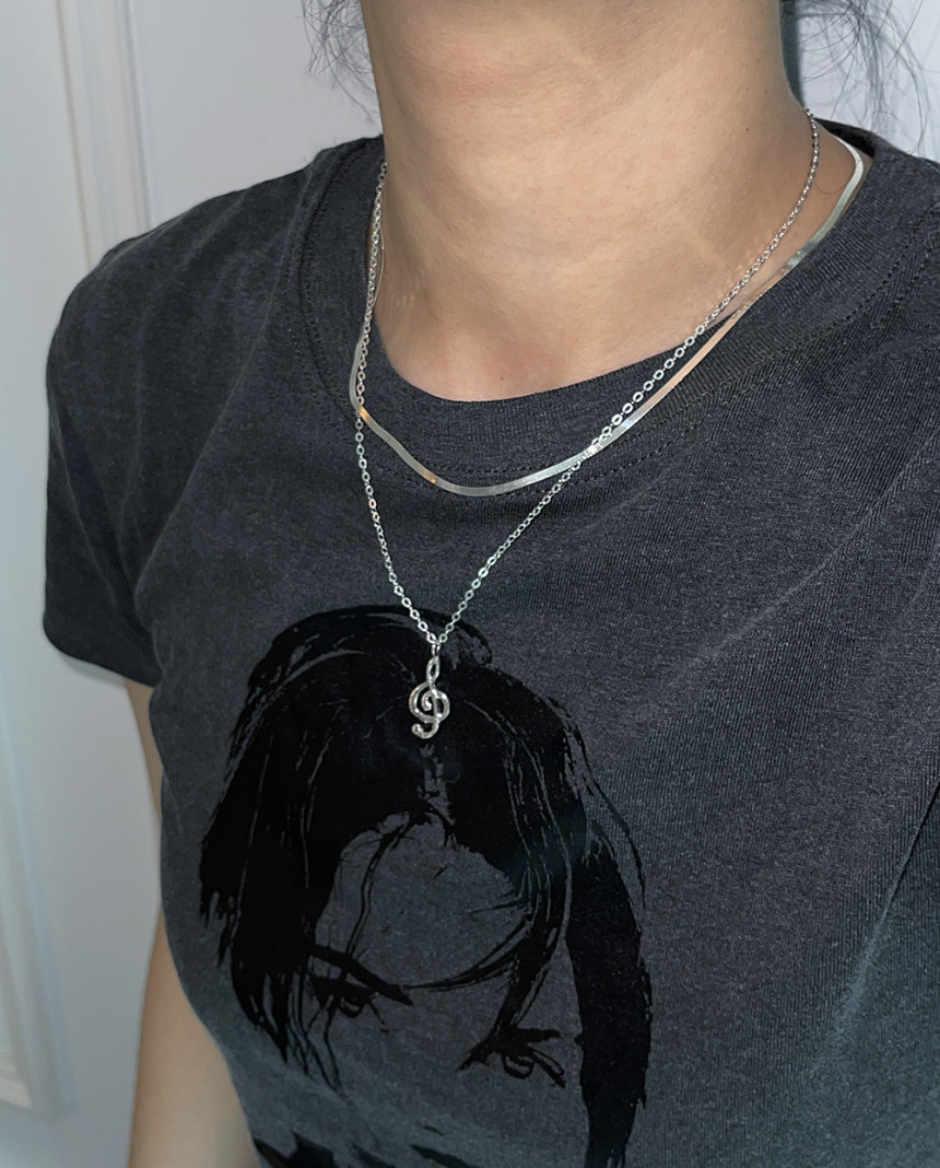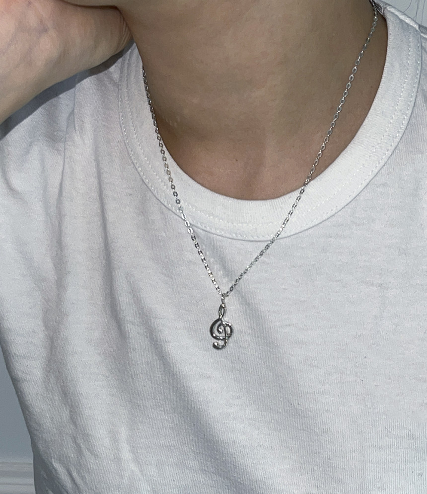 두께감이 있는 모줄에 텍스처가 있는 높은 음자리표 모양의 펜던트를 매치한 목걸이입니다.
