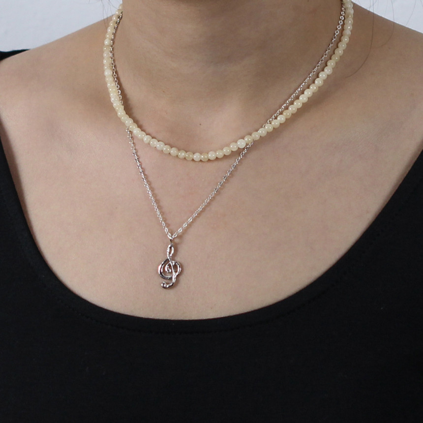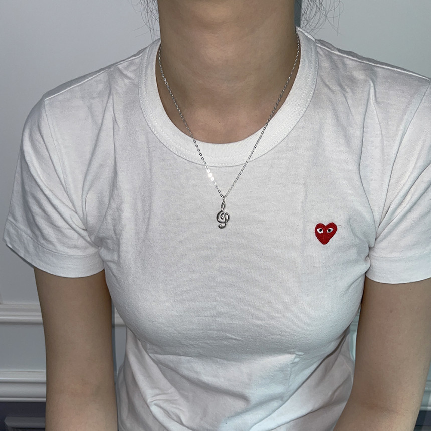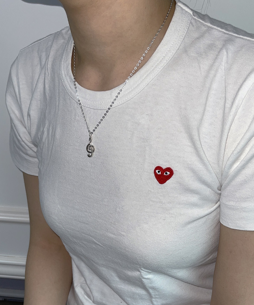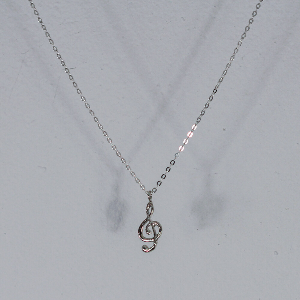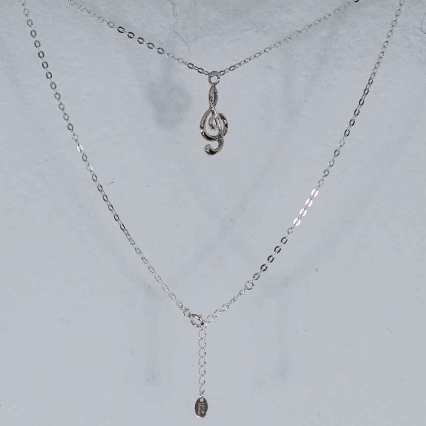 두께감이 있는 모줄에 텍스처가 있는 높은 음자리표 모양의 펜던트를 매치한 목걸이입니다.