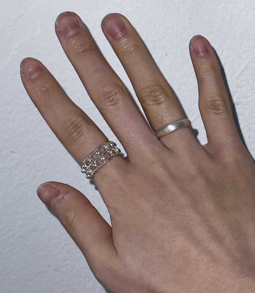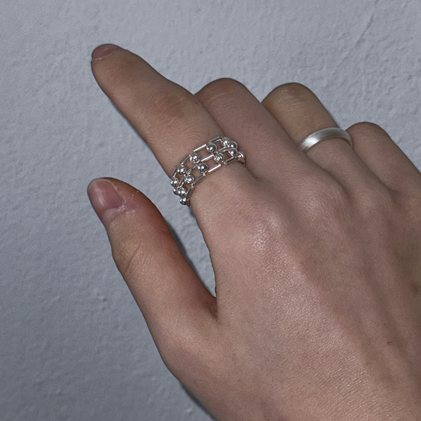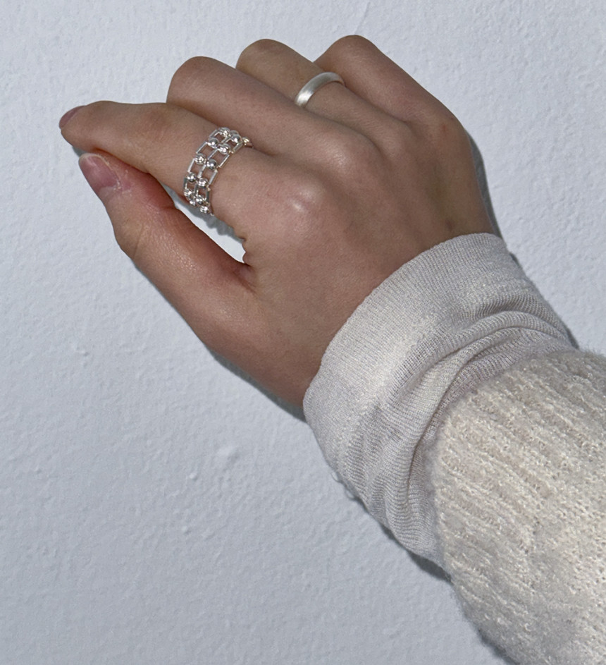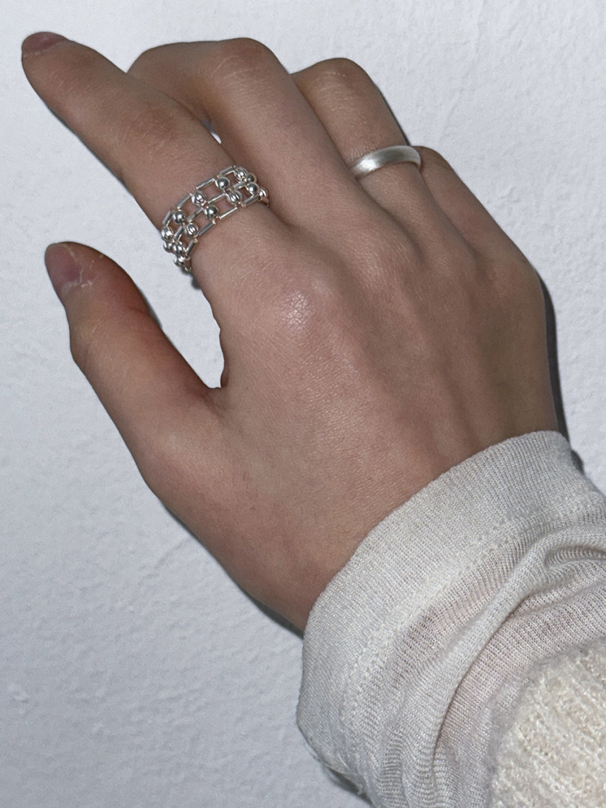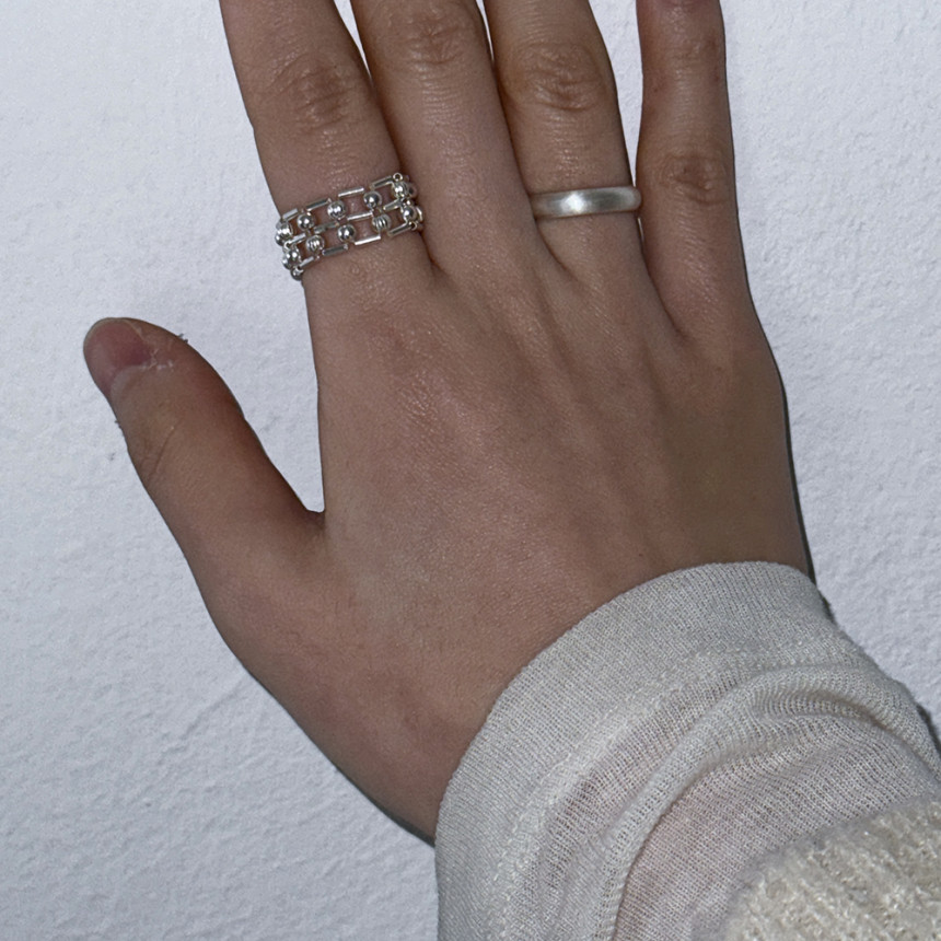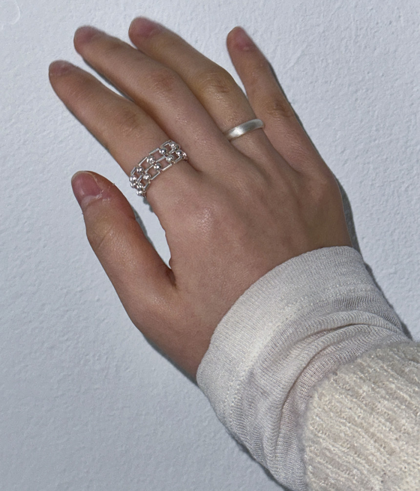 흡사 체인의 느낌이 나는 반지로 입체감이 크지 않지만 손가락에 감싸는 부분이 두꺼운 반지로