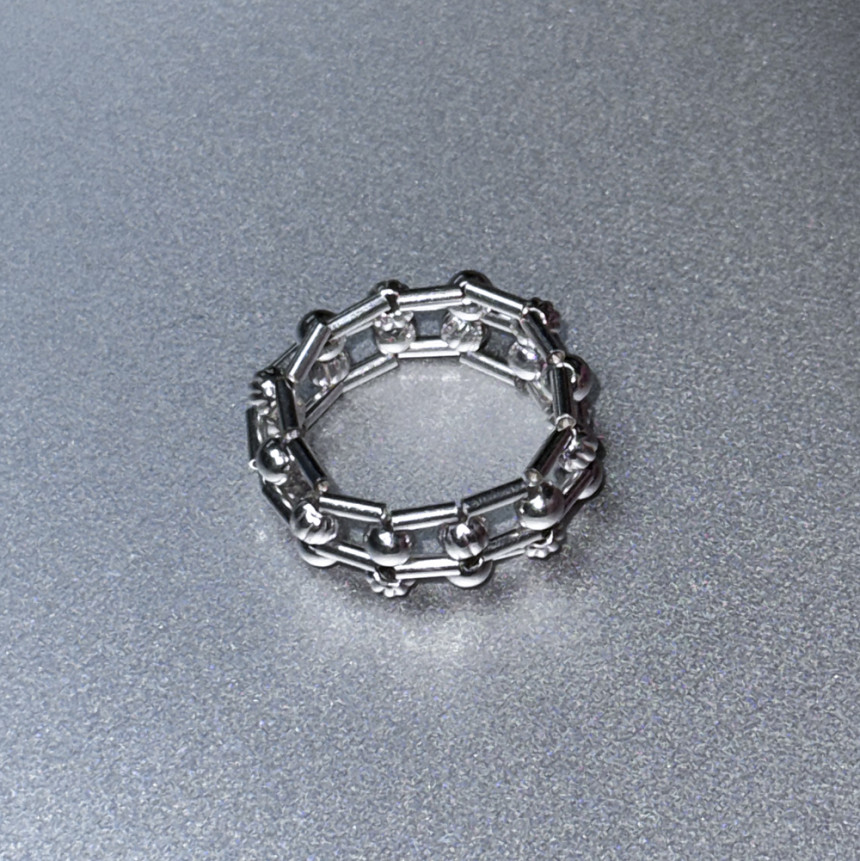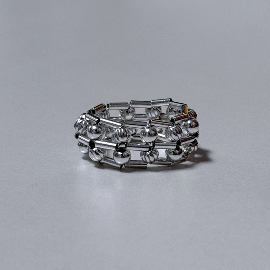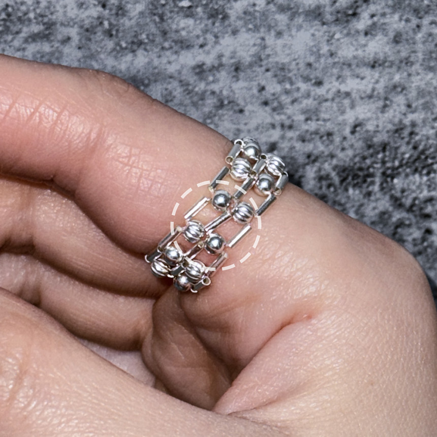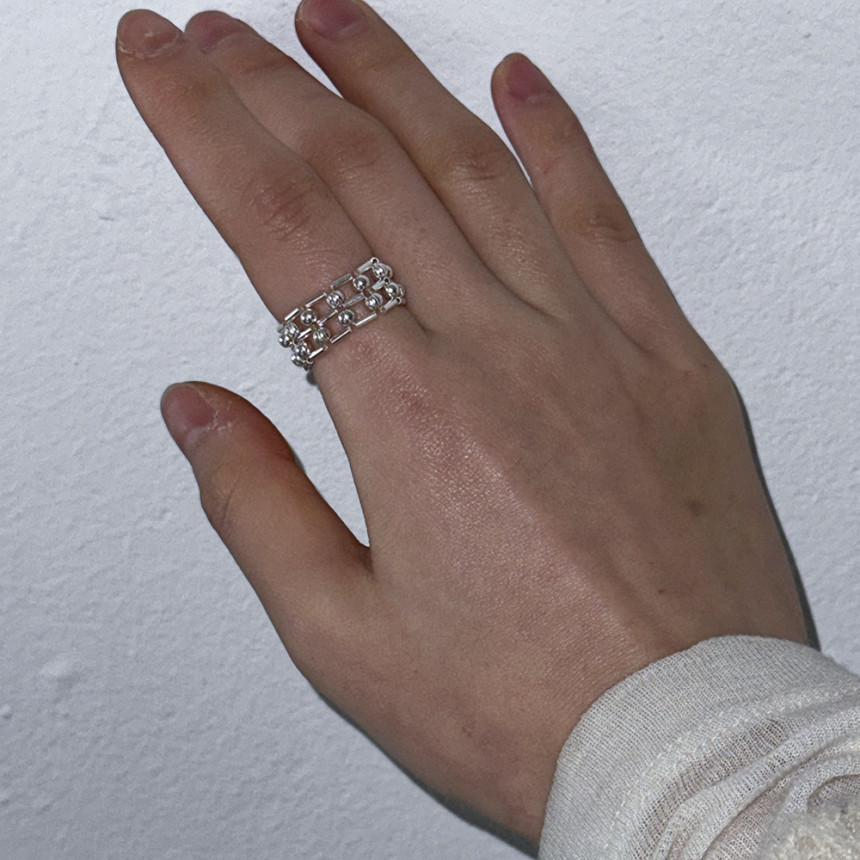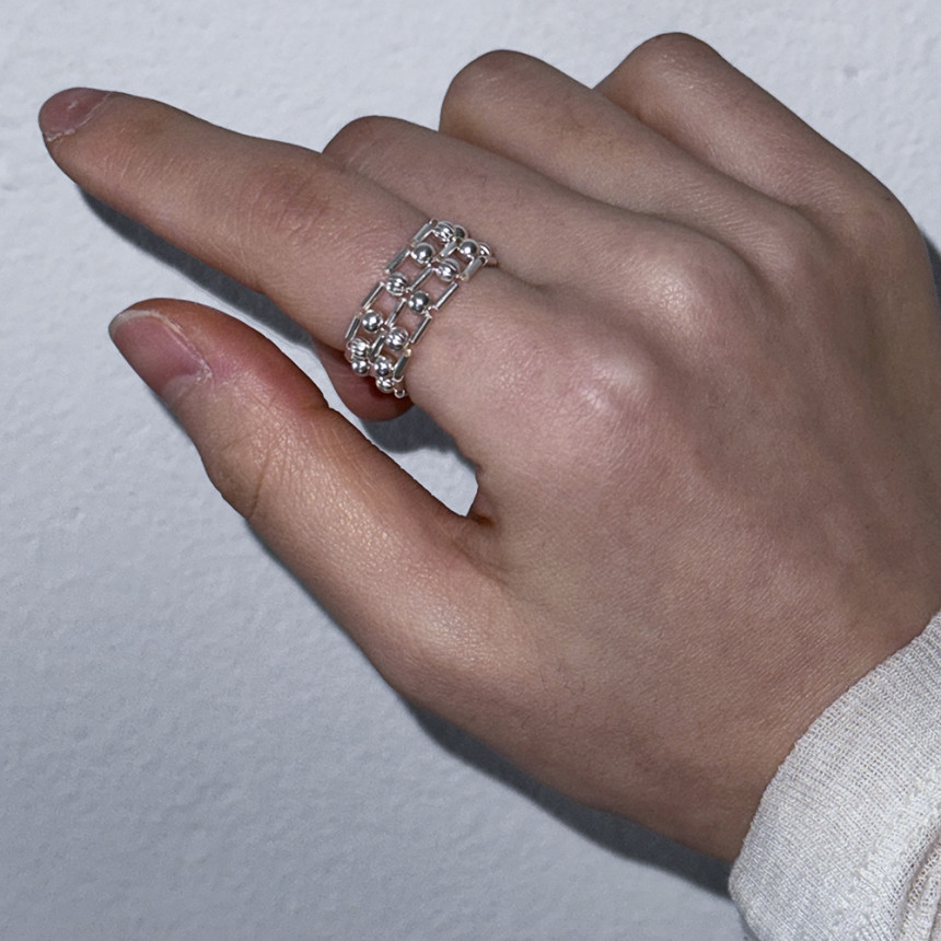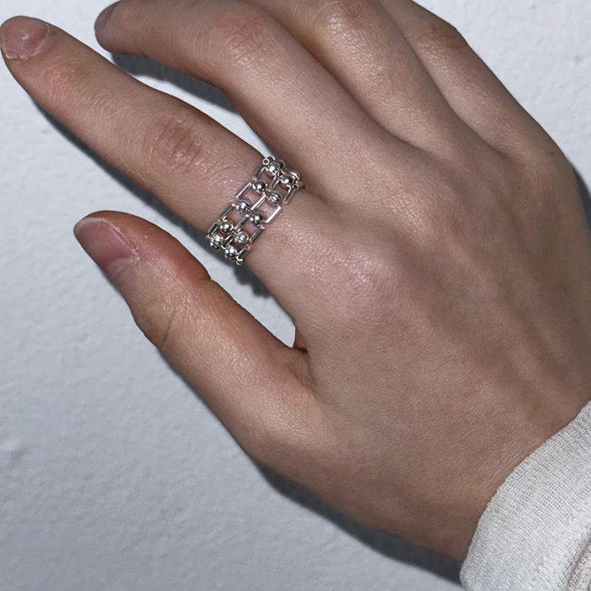 흡사 체인의 느낌이 나는 반지로 입체감이 크지 않지만 손가락에 감싸는 부분이 두꺼운 반지로
