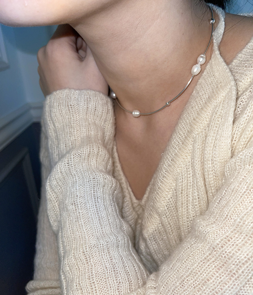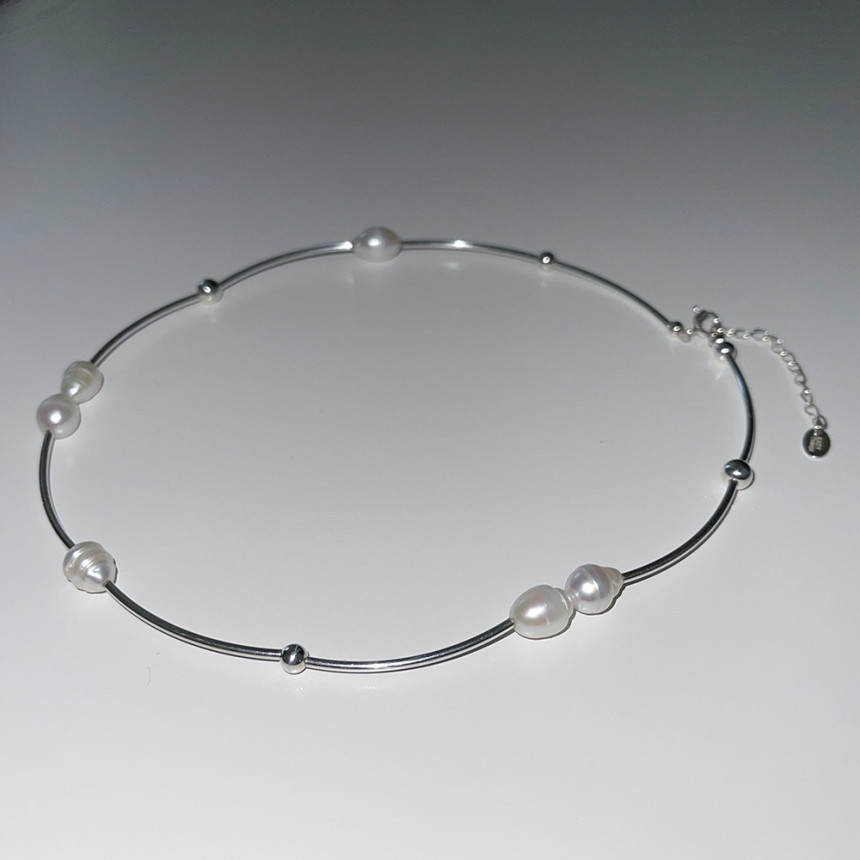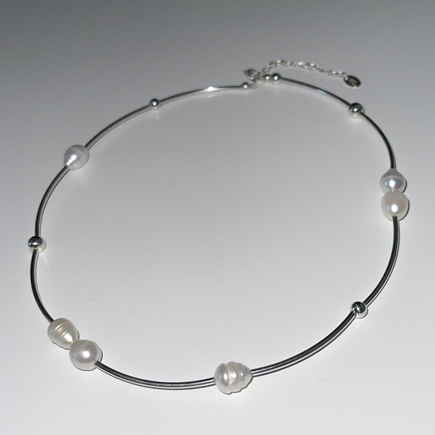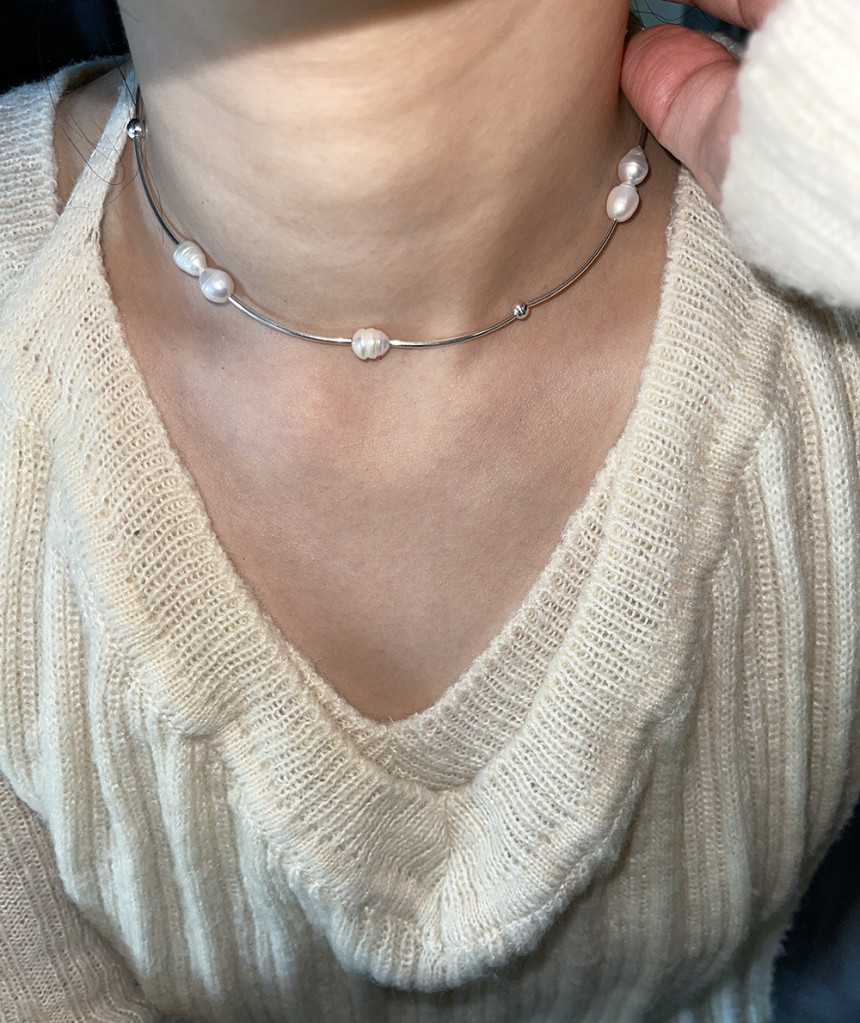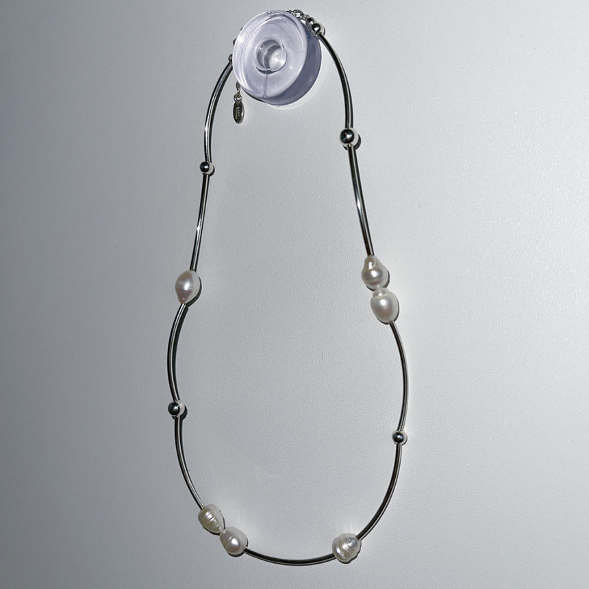 모양이 불규칙한 담수진주, 실버볼, 얇은 파이프로 제작된 목걸이입니다.