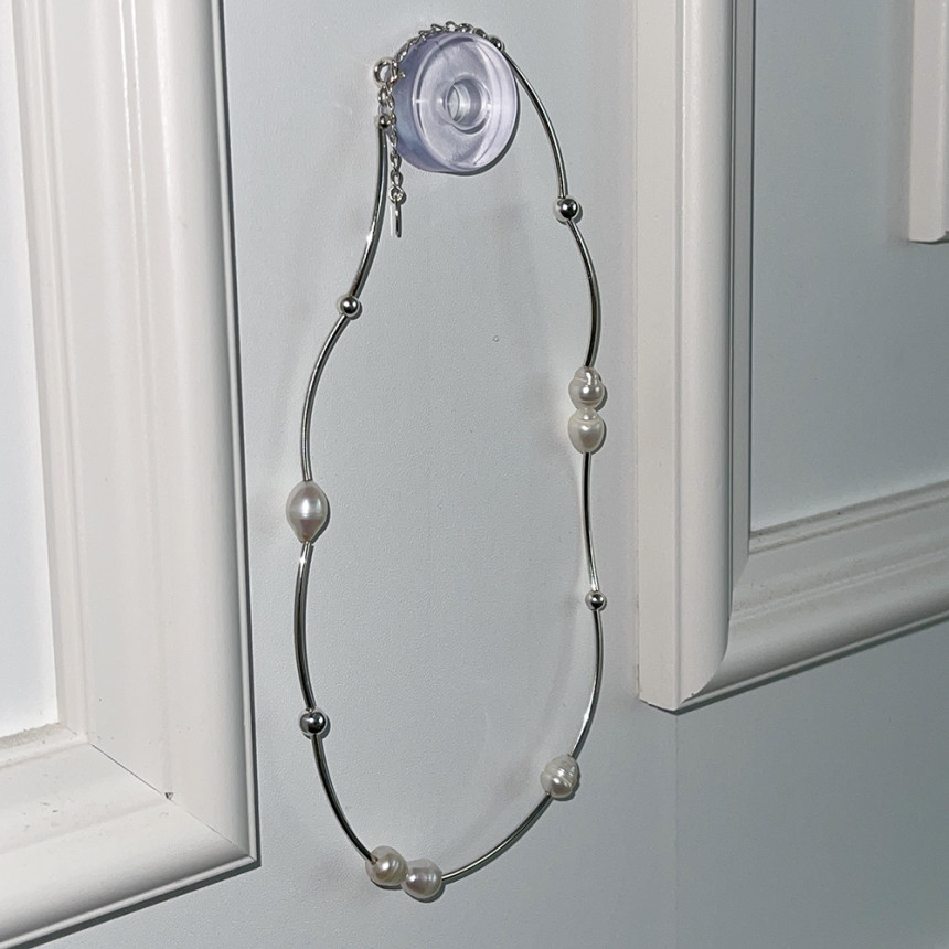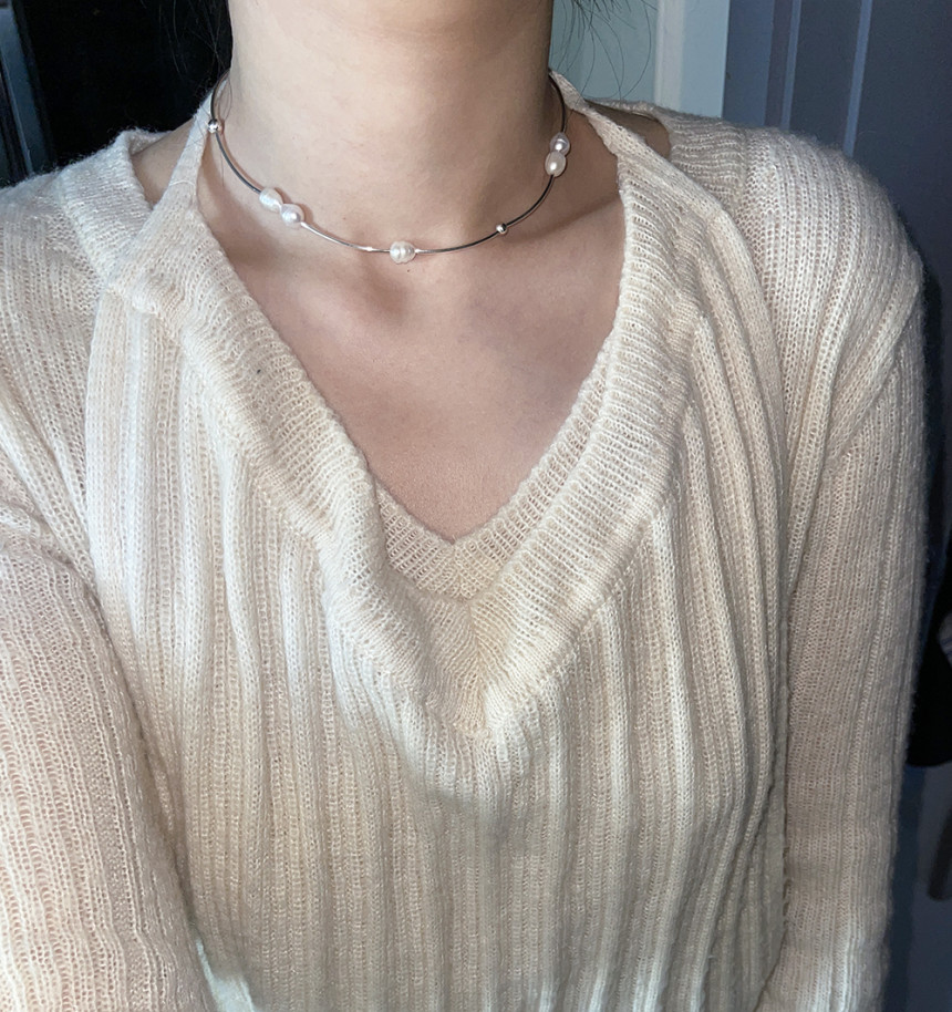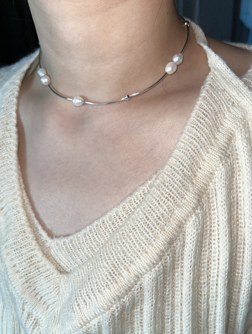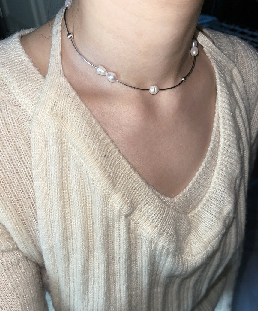모양이 불규칙한 담수진주, 실버볼, 얇은 파이프로 제작된 목걸이입니다.
