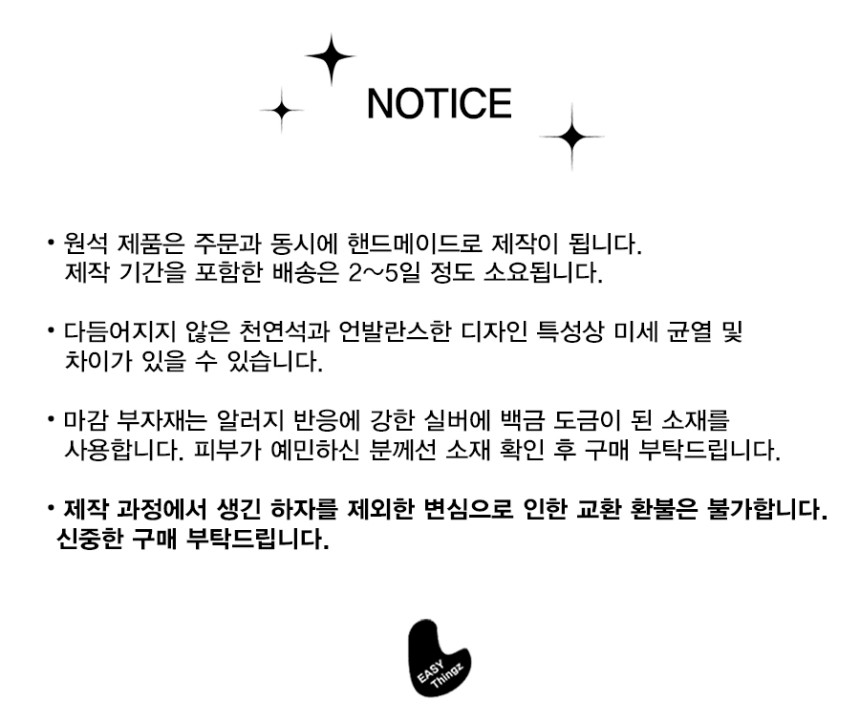 - 제품 특성상 단순 변심, 부주의에 의한 제품 손상 및 파손, 사용 및 개봉한 경우 교환/반품이 불가합니다.